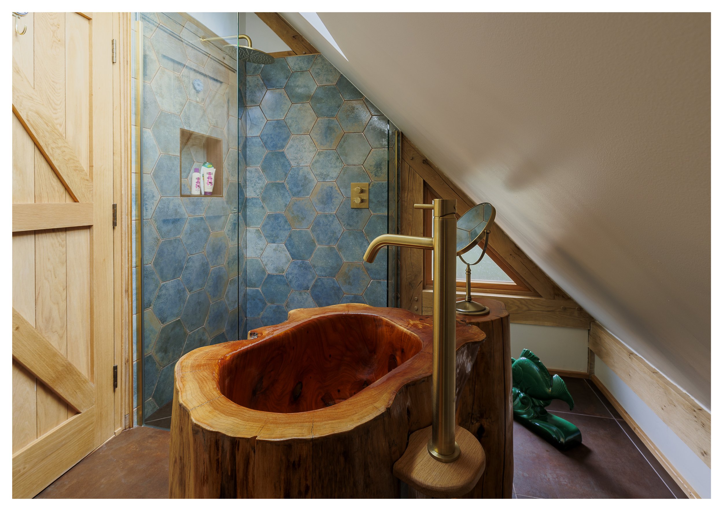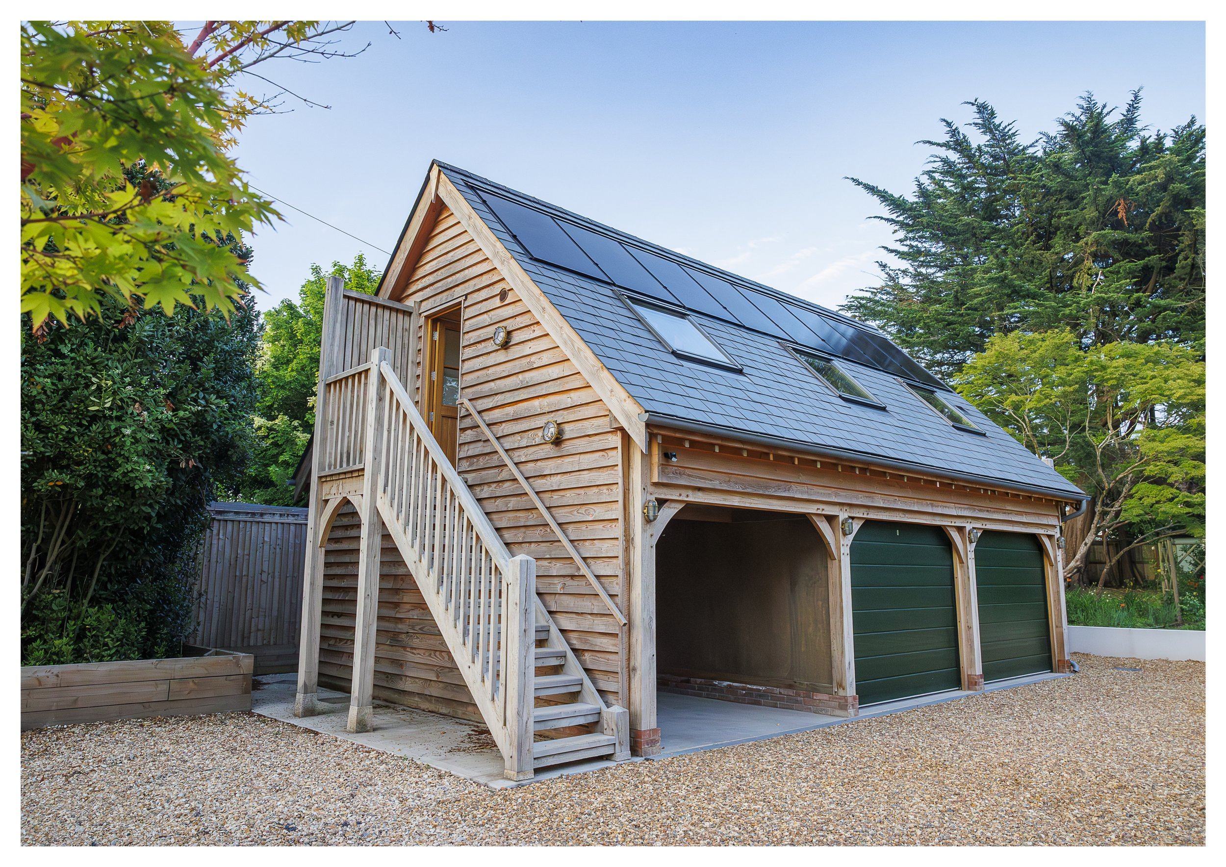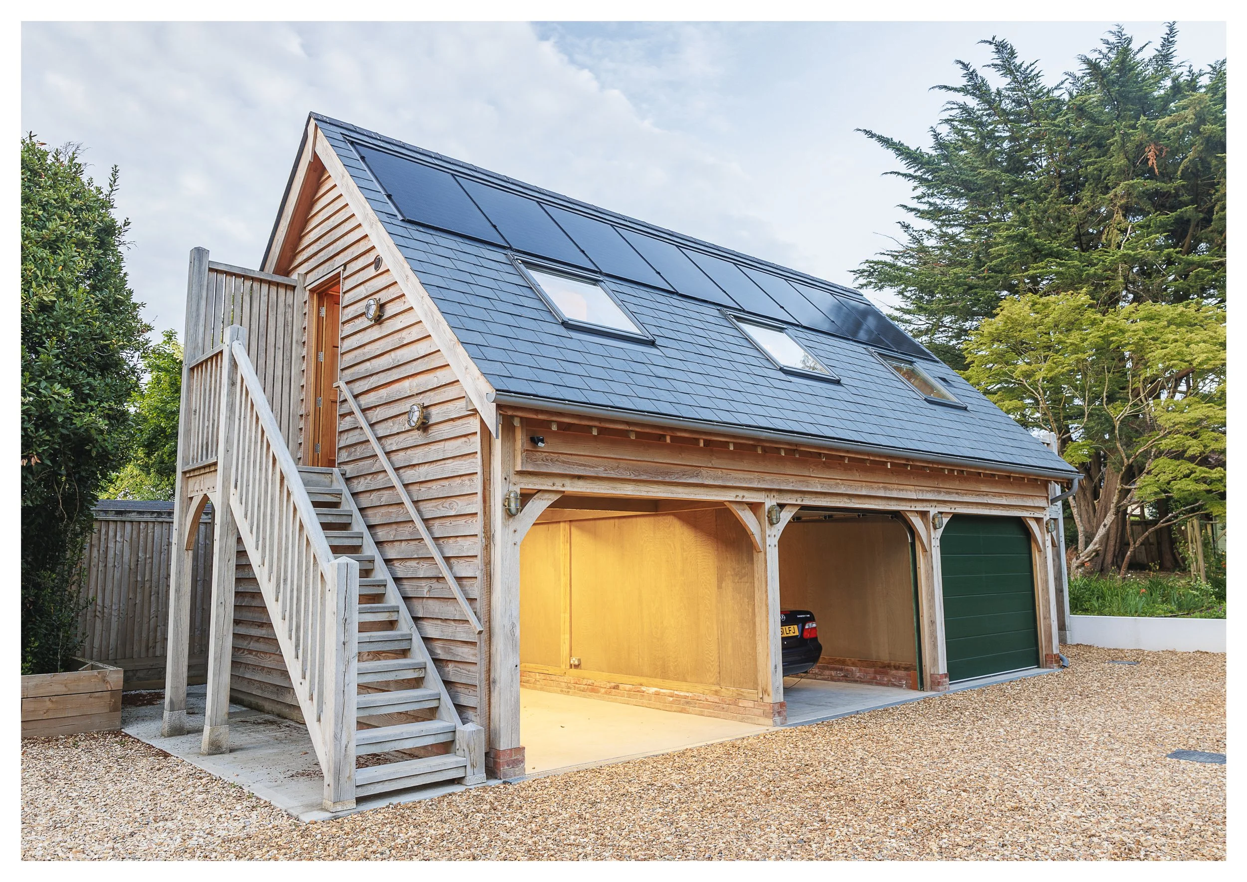 Oak Framed Garage & Accommodation A substantual 3 bay garage 2 with doors and one open. Accommodation above with kitchen, shower room bedroom area with bath and, balcony over looking the garden. Lots of tech with solar and air-conditioning. Contact Client